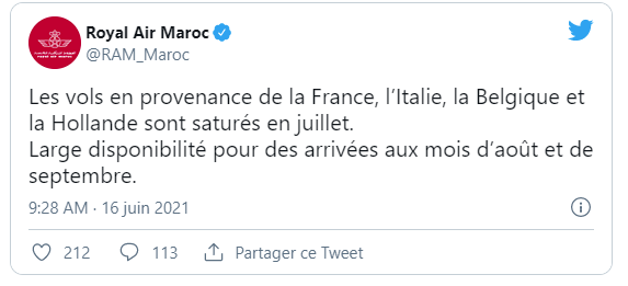 Royal Air Maroc annonce que les vols en provenance de la France, l'Italie, la Belgique et la Hollande sont saturés en juillet, par contre beaucoup de vols sont disponibles pour les arrivées aux mois d'août et de septembre.