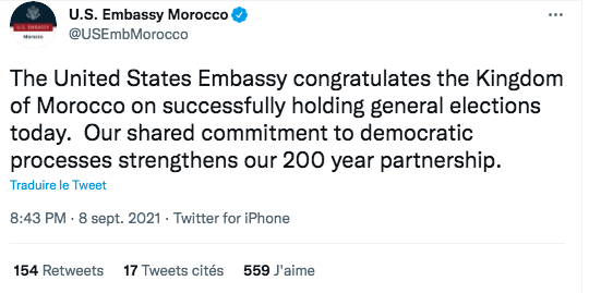 L'ambassade a fait ces commentaires dans une brève déclaration sur Twitter , qualifiant les élections générales « réussies » du Maroc d'expression des engagements démocratiques du pays.