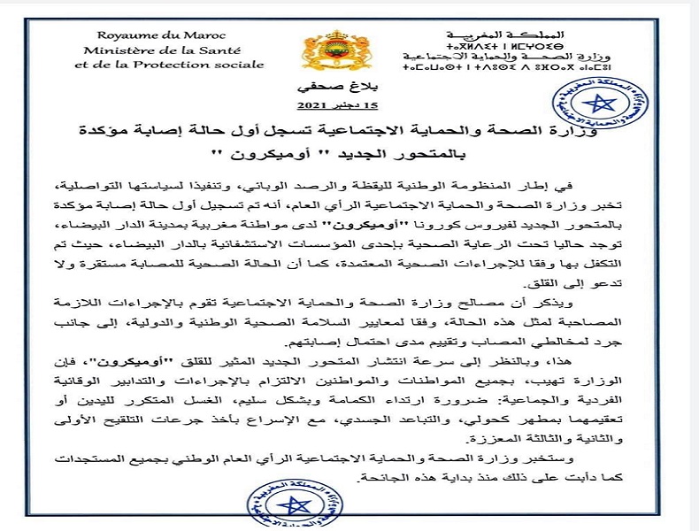 Le ministère de la Santé et de la protection sociale a annoncé ce mercredi la détection d'un premier cas du variant Omicron au Maroc.