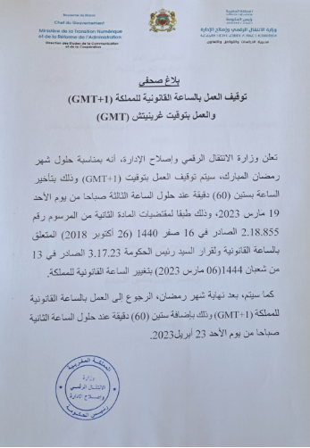Le ministère indique que dès la fin du mois sacré de Ramadan, le Maroc opérera un retour à l'horaire GLT+1 en avançant d'une heure le 23 avril 2023 à 2 heures du Matin.